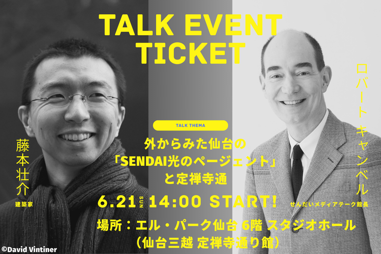 大阪・関西万博「大屋根リング」を設計された藤本壮介氏と、せんだいメディアテーク館長のロバート キャンベル氏のスペシャルトークショー開催決定いたしました!テーマは、”外からみた仙台の「SENDAI光のページェント」と定禅寺通”。この機会を是非お見逃しなく!