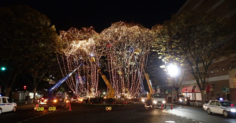 中村さん:一番おすすめしたいのは、イルミネーションの“揺れながら取り付けられる”瞬間です。11月中旬、深夜帯に行われる取り付け作業では、一部点灯させながら枝にイルミネーションを取り付けていきます。その時、光が風に揺れて、普段は静止しているイルミネーションがまるで生きているみたいに動くんです。
