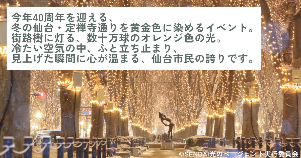 SENDAI光のページェント。40年もの間冬の仙台を彩り続けてきました。暖かな光の下で、誰かと歩き、誰かと笑いあった方もたくさんいるはず。